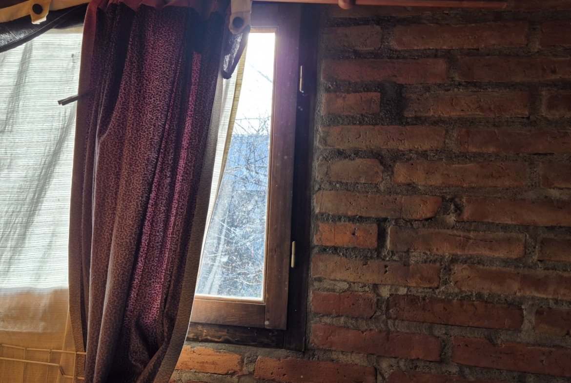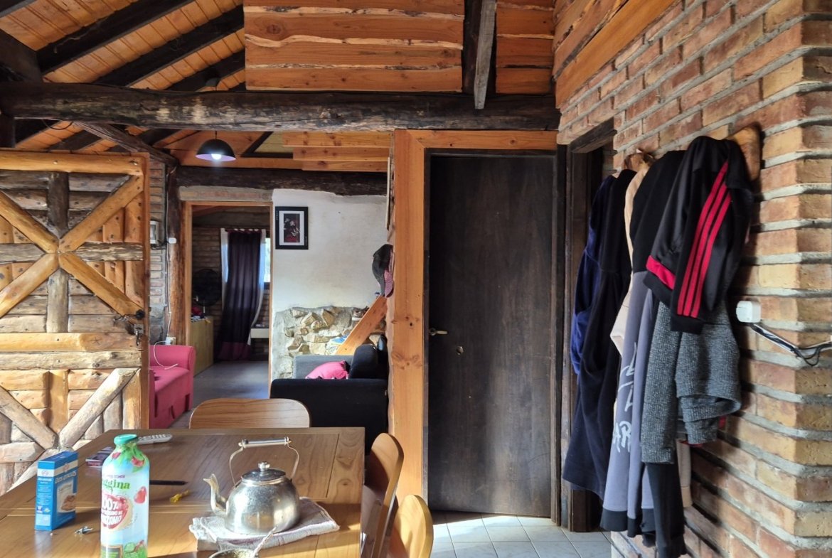 Casa de construcción tradicional en ladrillo con base de piedra de voladura, en el exclusivo barrio de Villa del Lago, ambientes amplios dos habitaciones, ventanales con aberturas de madera.