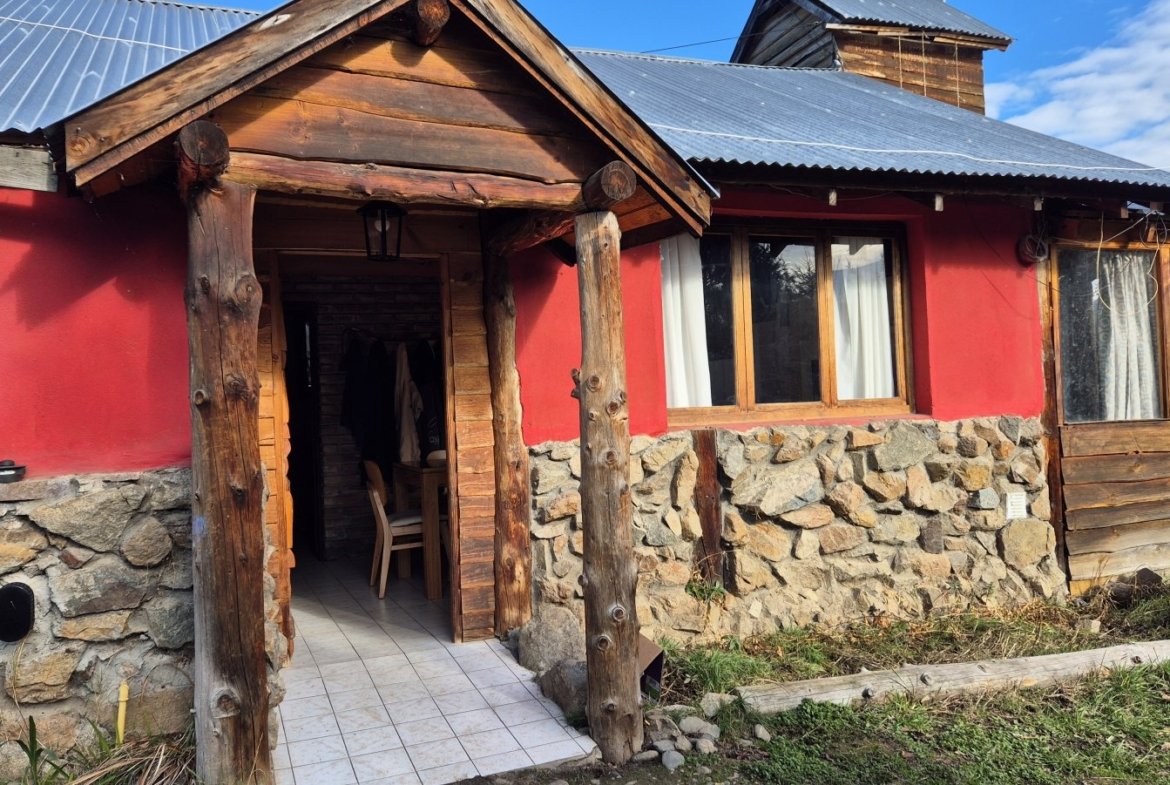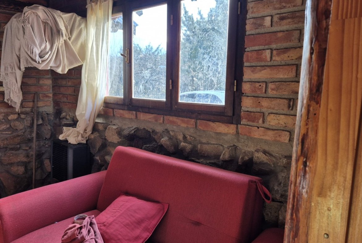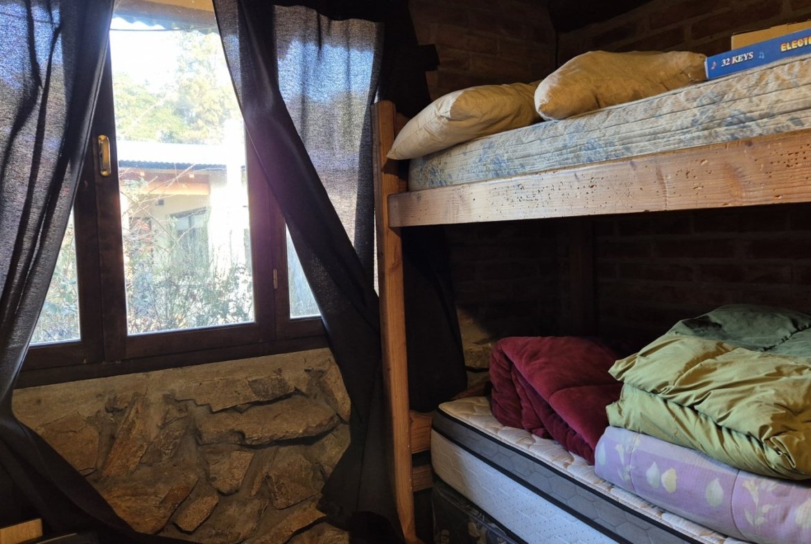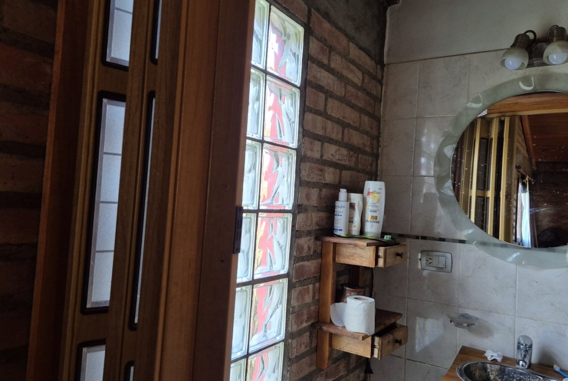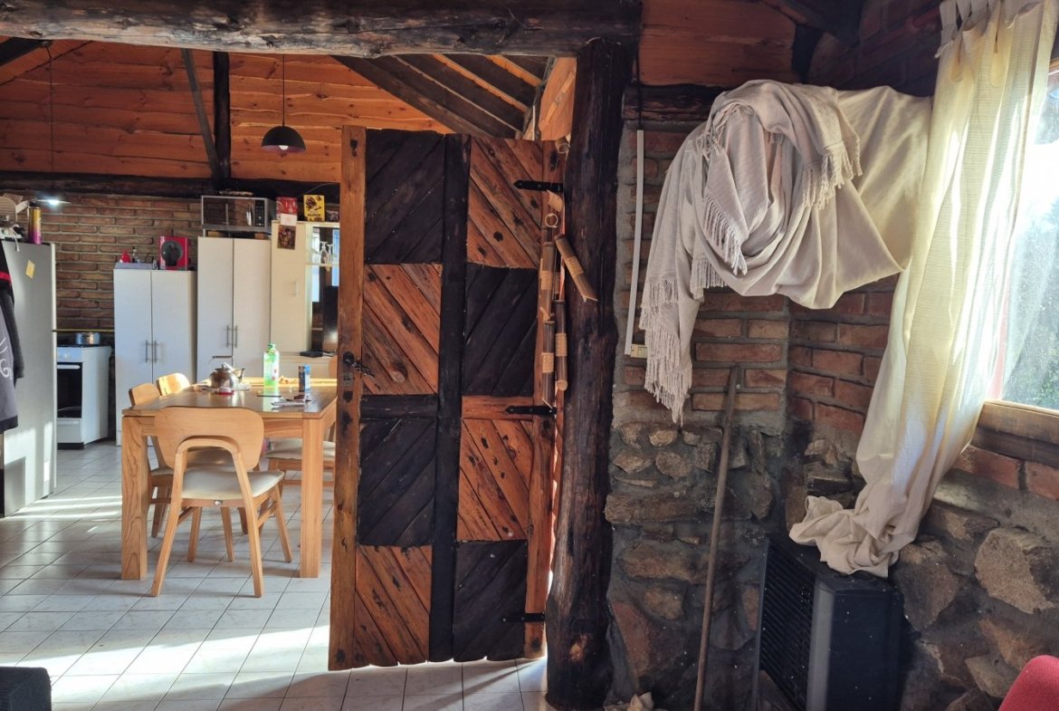 Casa de construcción tradicional en ladrillo con base de piedra de voladura, en el exclusivo barrio de Villa del Lago, ambientes amplios dos habitaciones, ventanales con aberturas de madera.