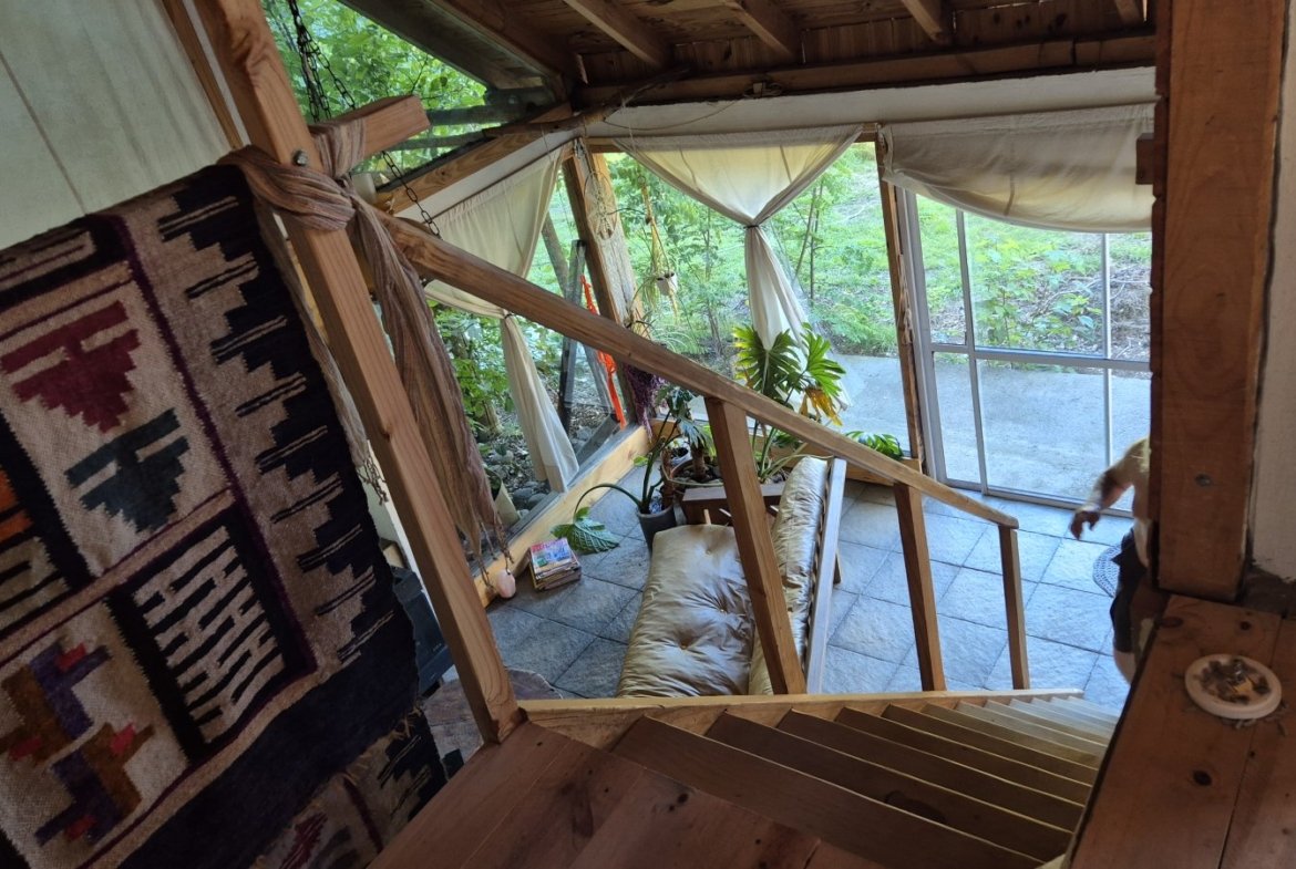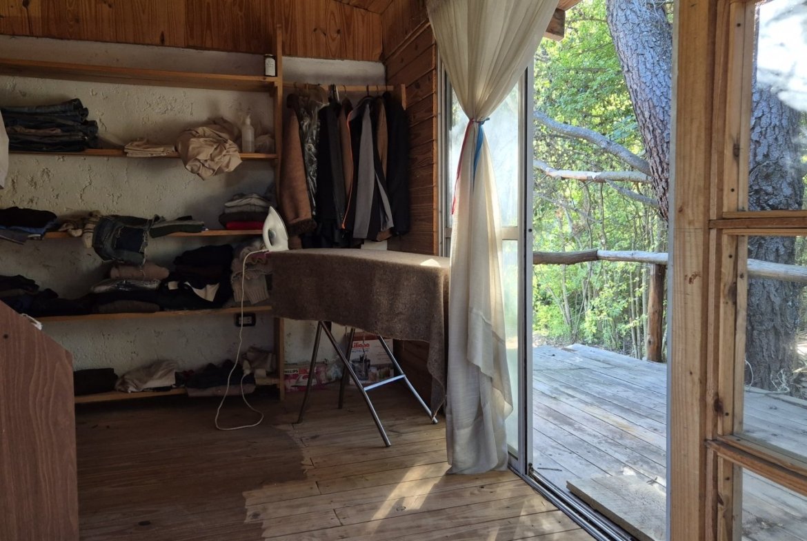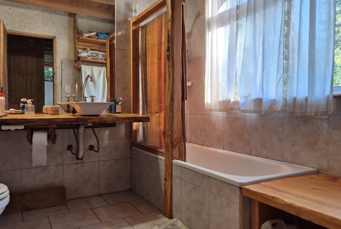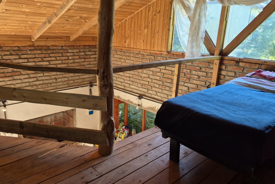 La vivienda ofrece un baño completo con bañera y un amplio dormitorio en entrepiso con balcón y grandes ventanales, que brindan excelente luminosidad y maravillosas vistas a los árboles y montañas que rodean la propiedad. También tiene una habitación extra. Cada ambiente se destaca por su luz natural y su conexión con el entorno.